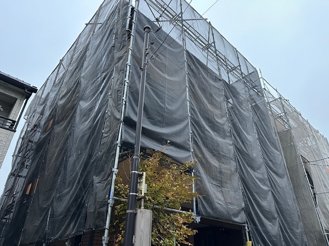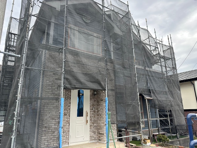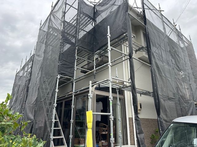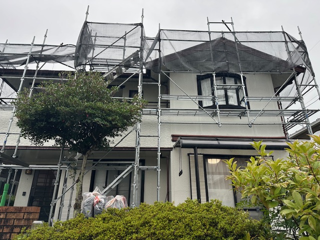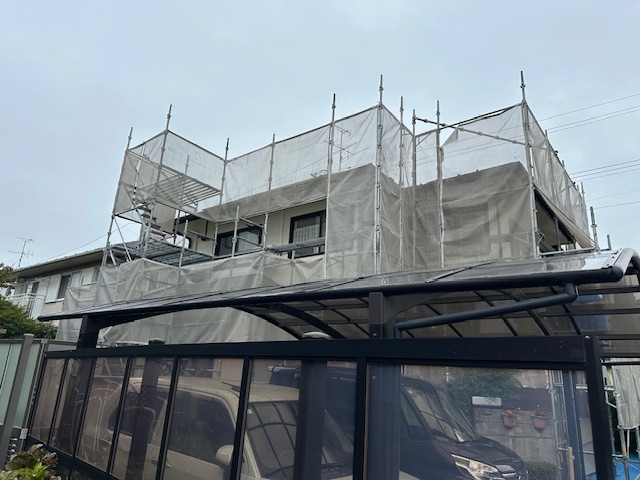 屋根塗装工事現場は、足場施工が終わり、高圧洗浄前になります。 メ… -