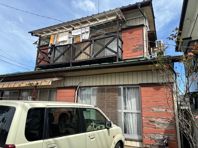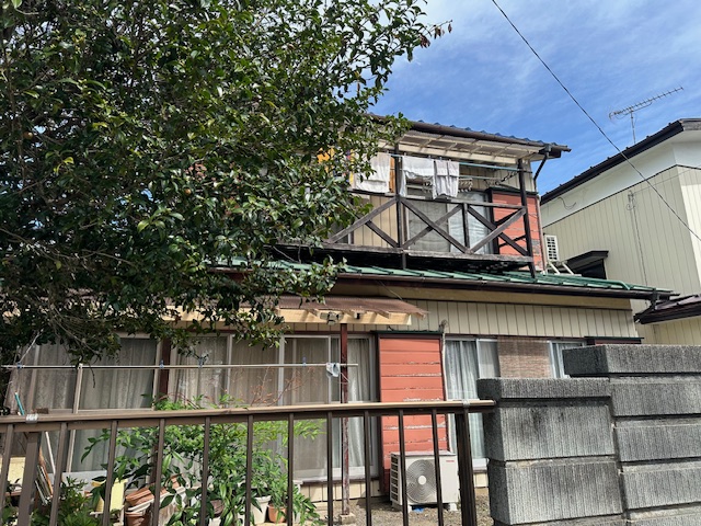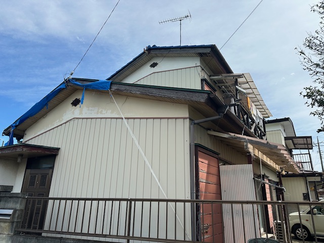 外装は屋根改修ガルバリウム鋼板、外壁金属サイディングカバー、雨樋改修、雨樋改修、ベランダ改修、玄関ドア改修と
