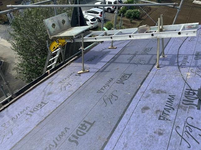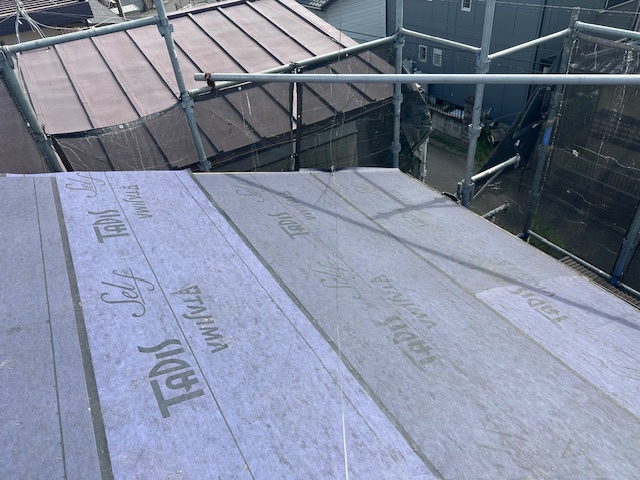 先日、大屋根の瓦材を解体し、野地板を貼り込み、ルーフィング施工が行われました。