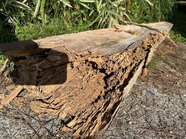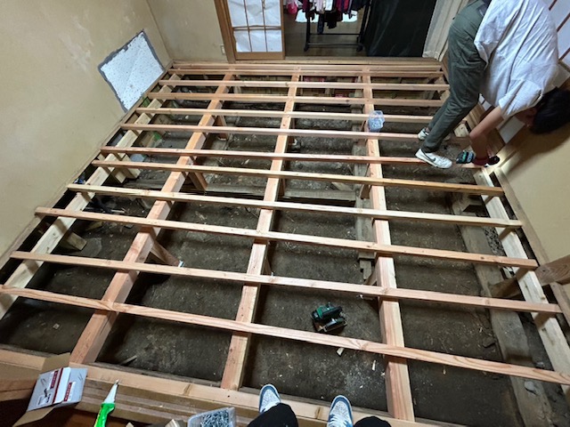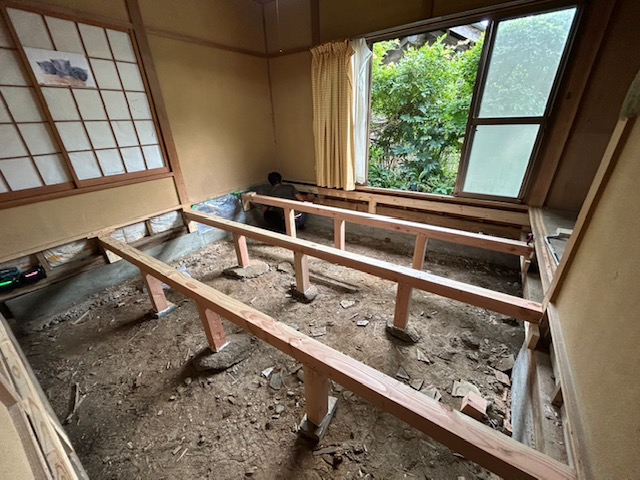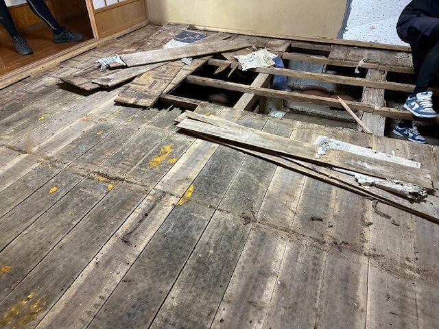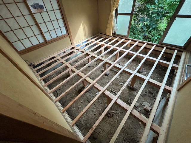 既存床材、根太、大引き、床束全てを解体して下地から造ります。解体すると「白アリ被害」が発見されましたので消毒を施して
