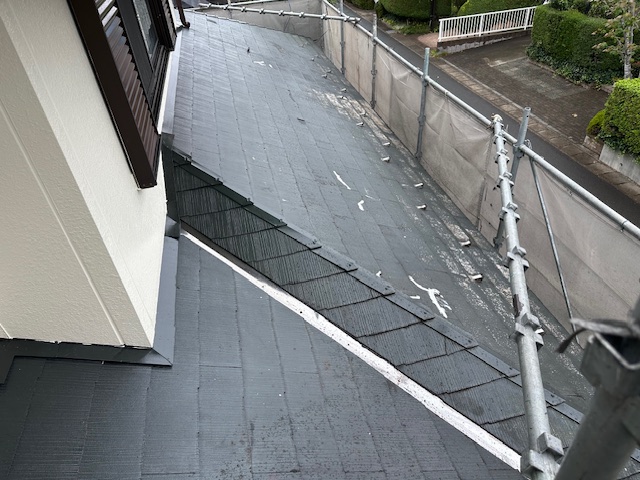 メーカーハウス建築の豪邸になり、屋根の形状は棟谷が多くある変形になりますので、ガルバリウム鋼板カバー施工の