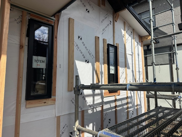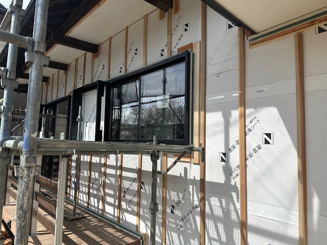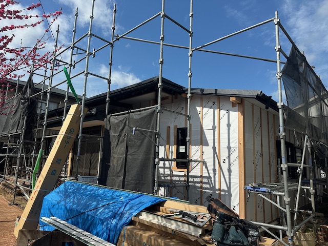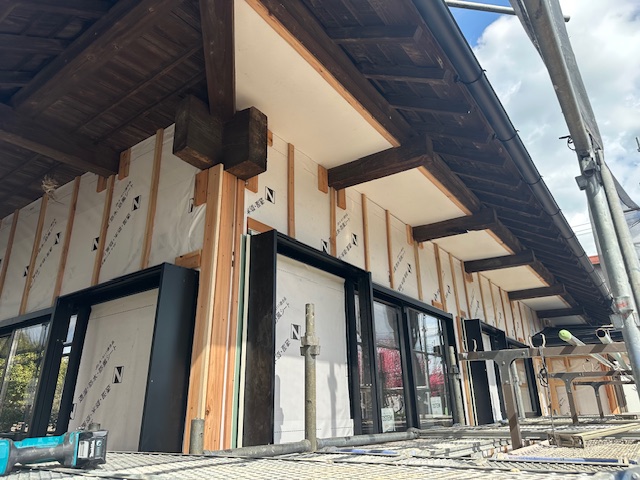 古民家再生リフォーム工事現場は、外壁の透水シートが施工され、