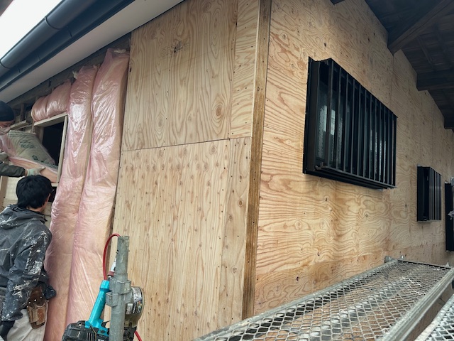 窓サッシの取付けが完了すると金属サイディング材の施工となります。
