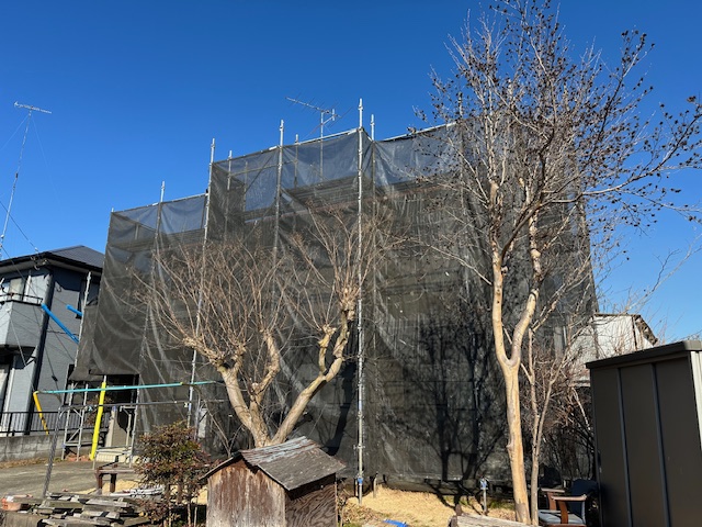 外装の高圧洗浄作業が終わり下地補修工事に入っています。